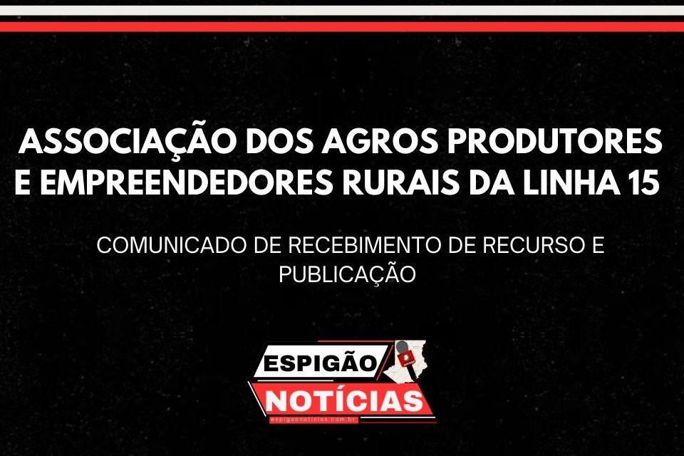 Edital COMUNICADO DE RECEBIMENTO DE RECURSO E PUBLICAÇÃO – ASSOCIAÇÃO DOS AGROS PRODUTORES E EMPREENDEDORES RURAIS DA LINHA 15 12/09/2025 14:43