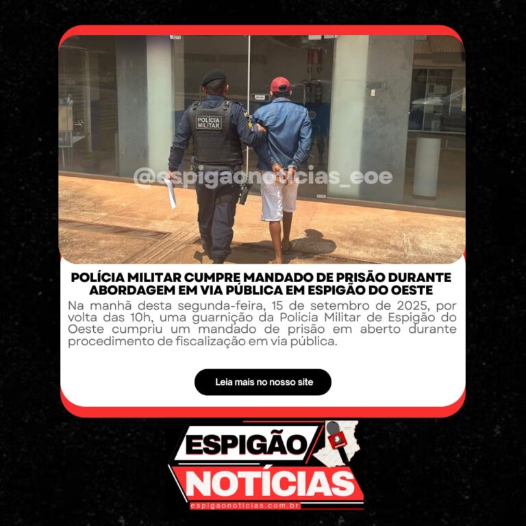 Na manhã desta segunda-feira, 15 de setembro de 2025, por volta das 10h, uma guarnição da Polícia Militar de Espigão do Oeste cumpriu um mandado de prisão em aberto durante procedimento de fiscalização em via pública.