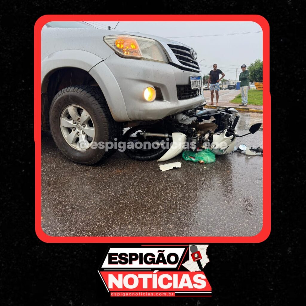 Segundo informações apuradas pelo Espigão Notícias, a Hilux seguia pela Rua Alagoas quando o motorista não respeitou a sinalização de parada obrigatória e atingiu a motocicleta conduzida por uma mulher idosa que transitava pela Rua Independência.