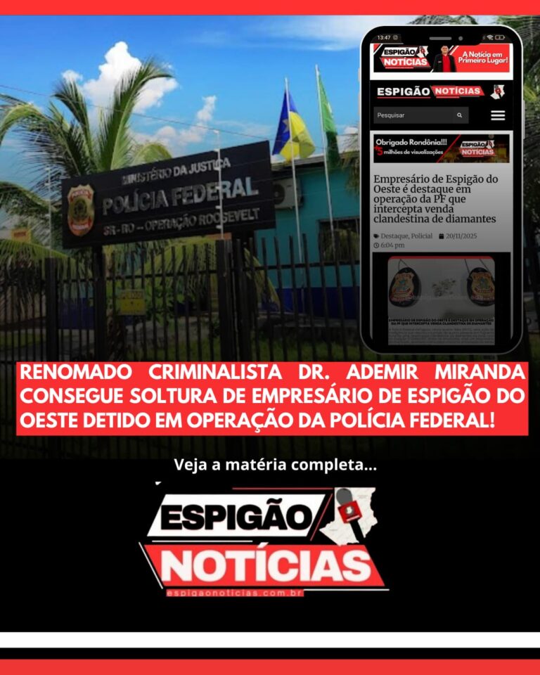 O advogado criminalista Dr. Ademir Miranda, amplamente reconhecido por sua atuação em caso de grande complexidade, por sua atuação técnica e combativa, obteve na Justiça a soltura do empresário de Espigão do Oeste que havia sido preso durante a operação da Polícia Federal que interceptou uma negociação clandestina de diamantes na zona rural do município.
