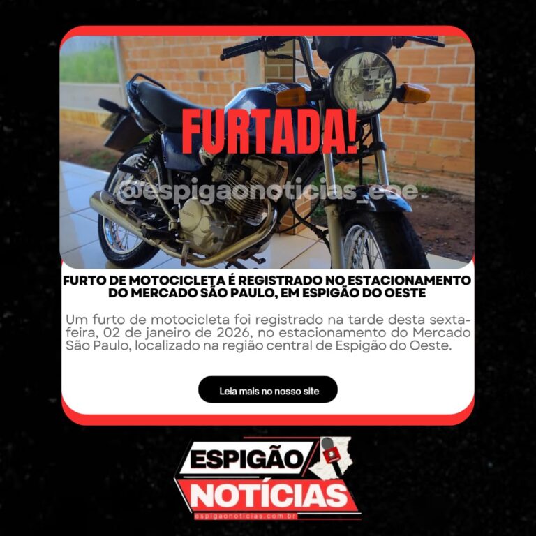 Um furto de motocicleta foi registrado na tarde desta sexta-feira, 02 de janeiro de 2026, no estacionamento do Mercado São Paulo, localizado na região central de Espigão do Oeste.